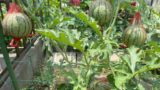 我が家の空中栽培中の小玉スイカの長男、太郎と次男、次郎の巻き髭が茶色に枯れたので収獲しました。